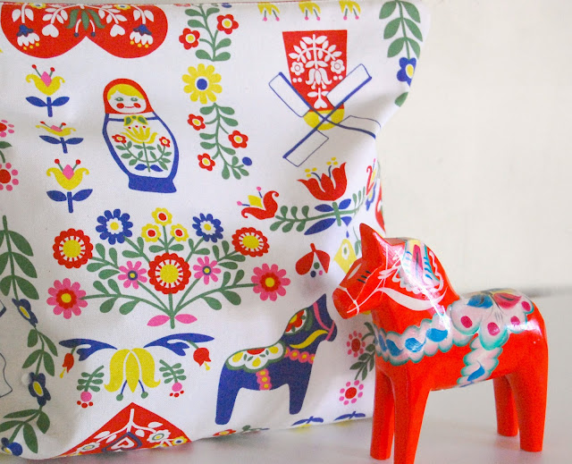I had to show off my new project bag that my mom (happylittlecottage) sewed for me! I am a novice sewer and the thought of sewing a zipper brought back nightmarish memories of high school sewing class. So I asked my mom to make it for me with super specific details - I wanted it with a red zipper, red polka dot lining, and measure 14" square. The fabric is kokka fabric that I have been coveting forever and finally found it at SuperBuzzy. It's been in the stash for awhile destined to become pillow covers (or so I thought).This fabric is probably the cutest thing ever with dalas, matryoshkas, windmills, flowers, and hearts.
